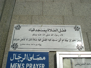 Papan kenyataan yang menuliskan Hadis RasulUllah SAW di atas ada di dinding masjid ini. Maksud Hadis itu ialah, ”Barang siapa membersihkan diri (berwuduk) di rumahnya, kemudian pergi ke masjid Quba lalu solat dua rokaat, maka baginya mendapat seperti pahala satu umrah” – hadis riwayat Ibnu Majah.